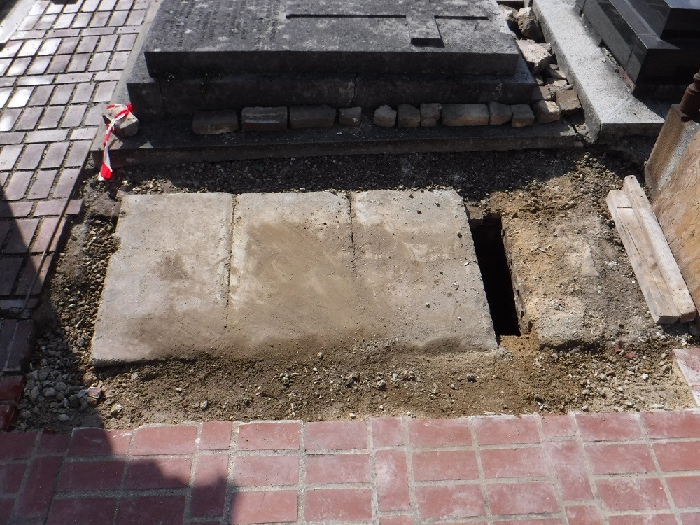 Wtórne płyty marmurowe pokrywających wapienne płyty oraz kamienie podstawy zostały zdemontowane, a naokoło tumb grobowych usuwane są wtórne nawarstwienia na nagrobku. Wykonano fundament pod obramowanie nagrobka tak, aby podwyższyć go o ok. 15 cm. Zdemontowane zostało również metalowe ogrodzenie, które w celu zabezpieczenia zostało przewiezione do pracowni. Płyty nakrywające są w bardzo złym stanie zachowania a montaż okładziny został wykonany z użyciem nieodpowiednich materiałów, w czasie kiedy płyty nakrywające były mokre. Docelowo zdemontowane płyty nagrobka po wykonaniu prac technicznych, a następnie konserwatorskich zostaną przywrócone.